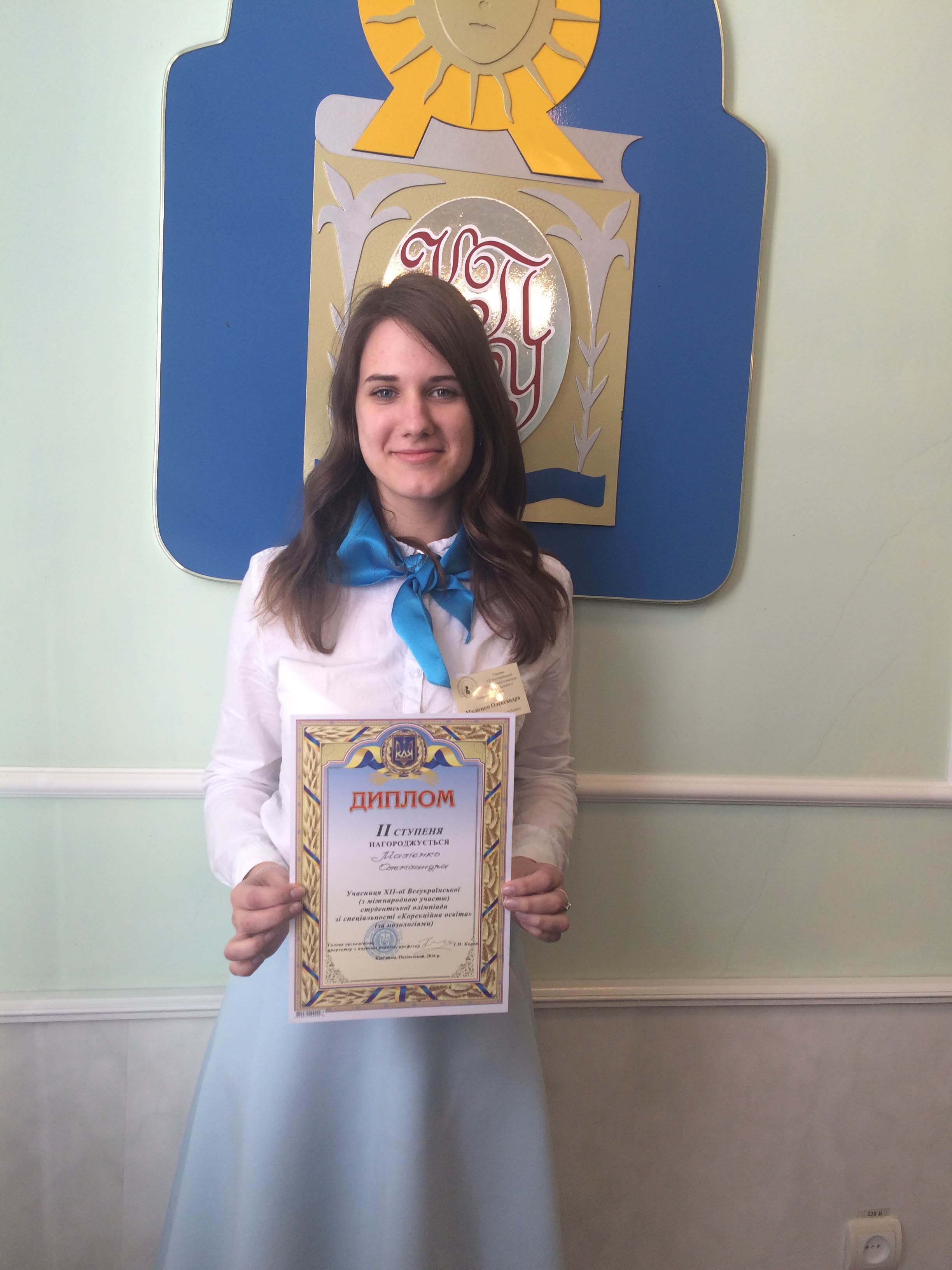 Вітаємо Малієнко Олександру та її наукового керівника з перемогою на студентській одімпіаді зі спеціальності «Корекційна освіта», бажаємо нових здобутків і відкритів у царині спеціальної освіти на славу науки України та рідного Університету.