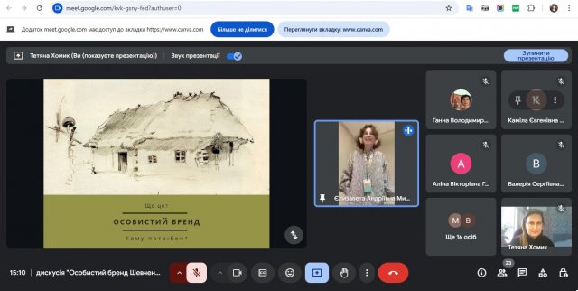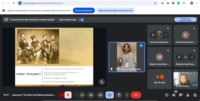 12 березня 2025 року для студентів 1 курсу спеціальності Спеціальна освіта освітньої програми «Логопедія» було організовано дискусію на тему: «Особистий бренд Шевченка – сучасний погляд». Під час зустрічі студенти обговорювали, яким чином Тарас Шевченко створив свій унікальний образ та як його творчість і особистість впливають на сучасне суспільство. До дискусії долучилася студентка 4-го курсу Єлизавета Михайленко, яка поділилася маловідомими фактами про особистий бренд Кобзаря. Разом із першокурсниками вона обговорила, що таке індивідуальний імідж, персональний бренд та професійний образ, і як ці поняття варто застосувати в майбутній професії . Учасники активно спілкувались, ділились думками та разом намагалися окреслити, яким має бути сучасний логопед і які риси допомагають йому будувати власний імідж у професійному середовищі. Модераторами заходу були куратори Супрун Ганна Володимирівна, старший викладач кафедри спеціальної та інклюзивної освіти та Хомик Тетяна Василівна, старший викладач кафедри спеціальної та інклюзивної освіти