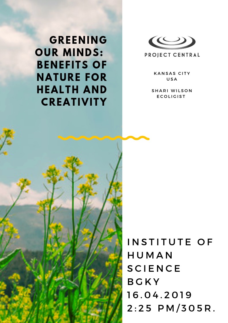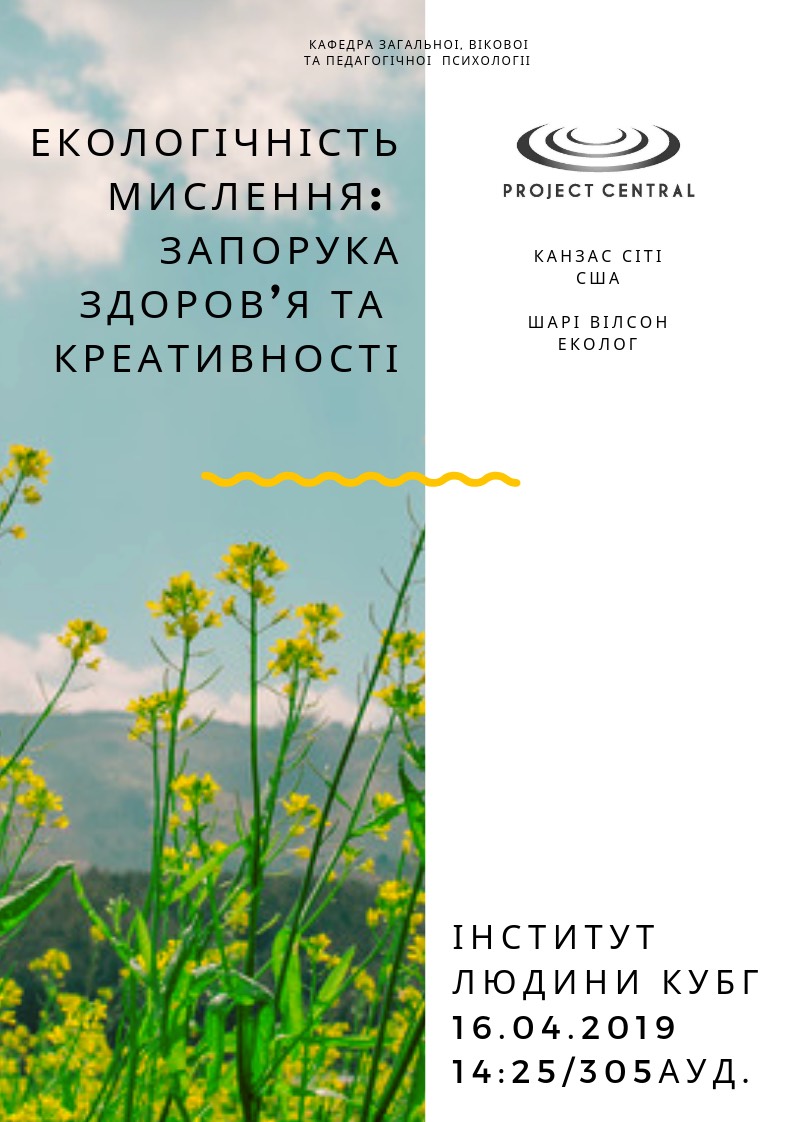 16 квітня 2019 року на кафедрі загальної, вікової та педагогічної психології Інституту людини Київського університету імені Бориса Грінченка відбудеться відкрита гостьова лекція Шарі Вілсон, Президента Центру Проектів м. Канзас Сіті (США), еколога, експерта з арт-практик на тему «Екологічність мислення: запорука здоров`я та креативності». Спікер запропонувала підняти питання розвитку та формування свідомого ставлення до природних ресурсів та навколишнього середовища, впровадження стратегій екологічної культури під час діалогу та збереження цілісності власного образу в ситуаціях невизначеності та стресу.