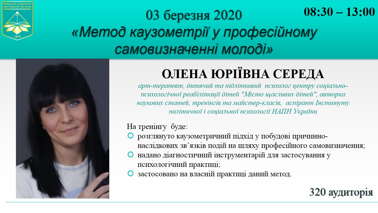 03 березня 2020 року в межах навчальної дисципліни "Тренінг професійної кар'єри" відбудеться майстер-клас «Метод каузометрії у професійному самовизначенні молоді», який буде проводити запрошений спікер, арт-терапевт, дитячий та підлітковий психолог центру соціально-психологічної реабілітації дітей "Місто щасливих дітей", авторка наукових статей, тренінгів та майстер-класів, аспірант Інституту політичної і соціальної психології НАПН України Олена Юріївна Середа.