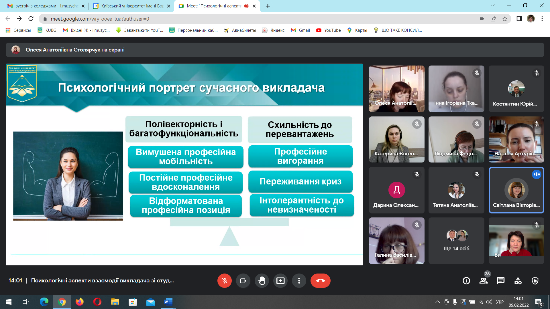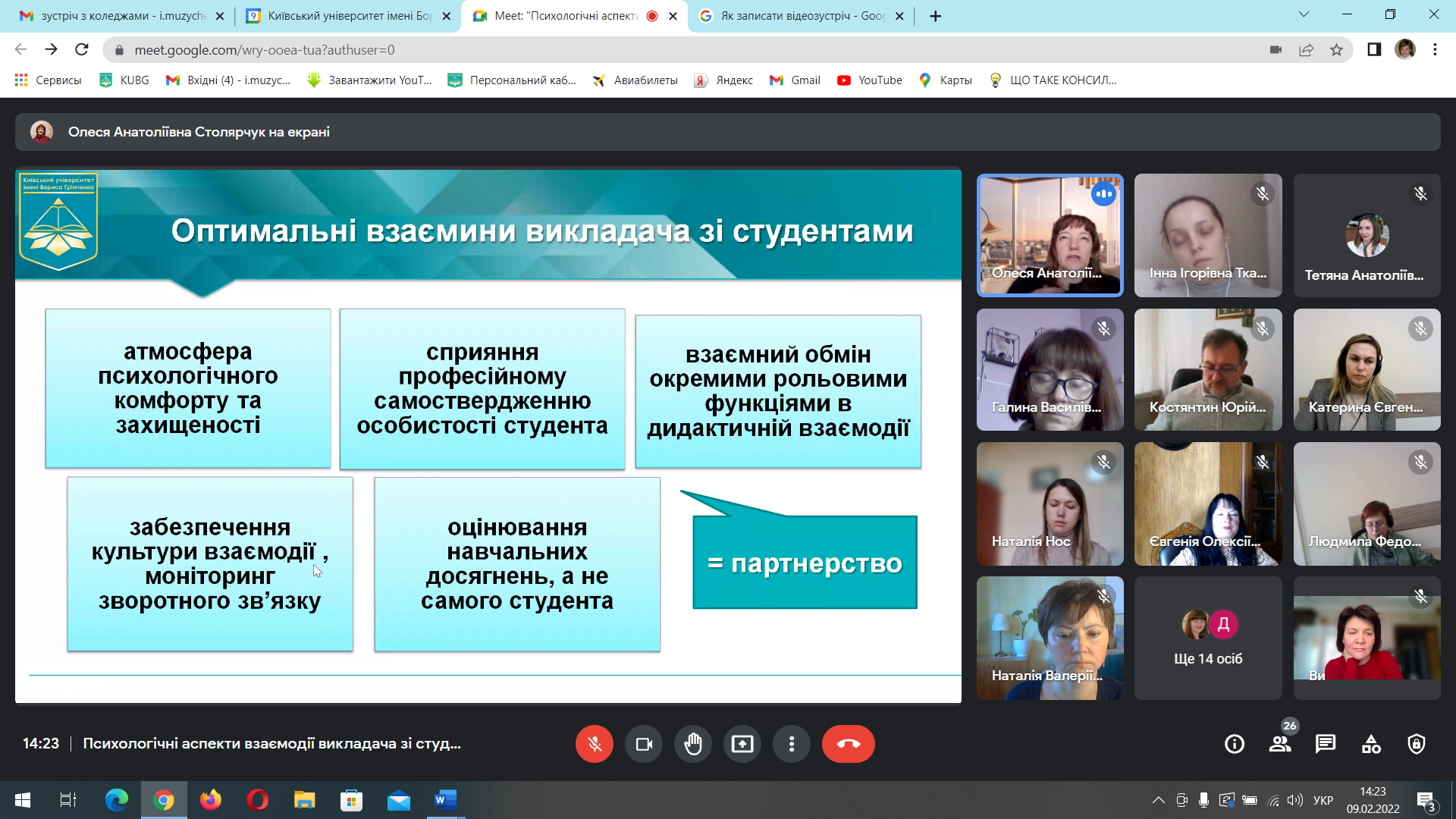 Сьогодні, 9 лютого, відбулась лекція "Психологічні аспекти взаємодії викладів зі студентами", на якій обговорювали кризи професійного навчання та дистанційного навчання, аналізували психологічні проблеми студентів і ще було багато корисної інформації. Щиро вдячні нашим спікерам: Столярчук О.А., доктору психологічних наук, доценту, доценту кафедри психології особостості та соціальних практик та Миколенко Н.В., старшому викладачу кафедри практичної психології, координатору Соціально-психологічної служби Київського університету імені Бориса Грінченка.