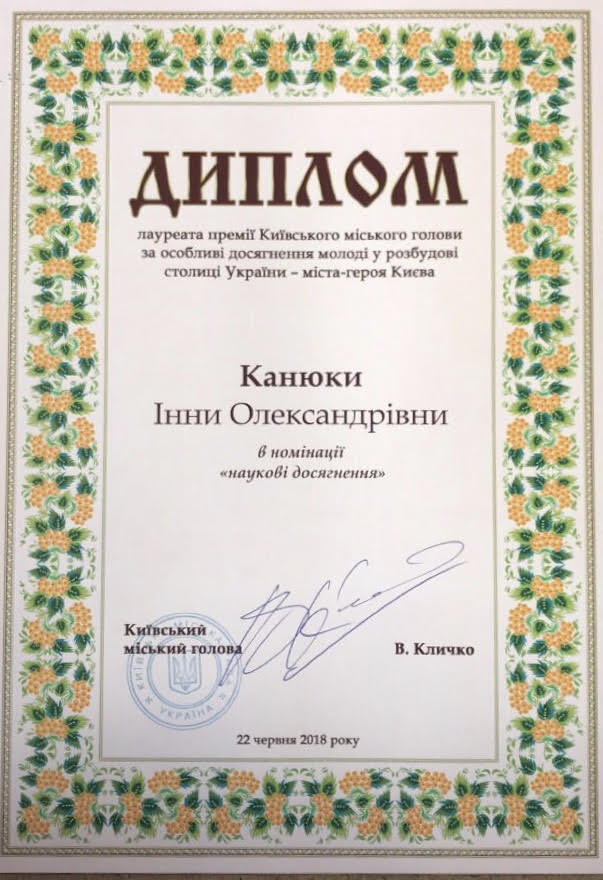 За наукові досягнення премією Київського міського голови за особливі досягнення молоді у розбудові столиці України – міста-героя Києва нагороджено старшого викладача кафедри загальної, вікової та педагогічної психології Інституту людини, Канюку Інну Олександрівну. За результатами засідання конкурсної комісії було відібрано 100 найкращих, молодих та талановитих кандидатів на присудження премії із них: за наукові досягнення – 50, за творчі досягнення – 19, за внесок у розвиток молодіжного руху – 30. Персональний склад конкурсної комісії сформовано із представників місцевих органів виконавчої влади, органів місцевого самоврядування, провідних фахівців у сфері науки, освіти, культури, спорту, мистецтва, активістів молодіжного громадського руху, громадських діячів тощо.