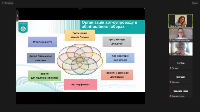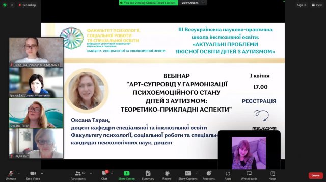 Так, доцент кафедри спеціальної та інклюзивної освіти Факультету психології, соціальної роботи та спеціальної освіти, кандидат психологічних наук, доцент Оксана Таран на вебінарі «Арт-супровід у гармонізації психоемоційного стану дітей з аутизмом: теоретико-прикладні аспекти» зосередила увагу присутніх на розгляді сутності, функцій та аспектів реалізації арт-супроводу для гармонізації психоемоційного стану дітей з аутизмом як умови їхнього ефективного розвитку, соціалізації, виховання і навчання.