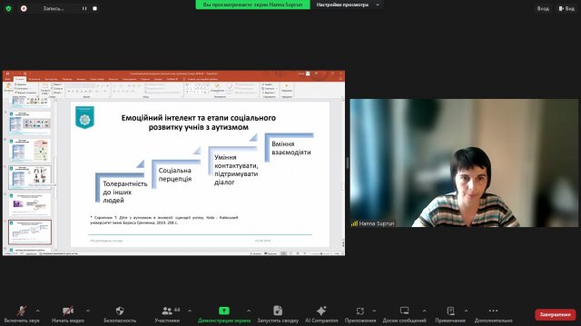 Під час вебінару «Соціалізація дітей молодшого шкільного віку з аутизмом» старший викладач кафедри спеціальної та інклюзивної освіти Факультету психології, соціальної роботи та спеціальної освіти, кандидат психологічних наук Ганна Супрун акцентувала увагу присутніх на розгляді алгоритму формування здатності дітей молодшого шкільного віку з аутизмом до соціалізації.