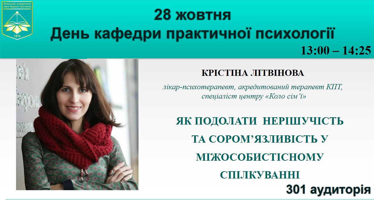 28 жовтня 2019 року в День кафедри практичної психології відбувся майстер-клас Крістіни Літвінової, лікаря-психолога, акредитованого КПТ-терапевта, консультанта схема-терапії, фахівця Київської філії центру розвитку та здоров’я «Коло сім’ї».
