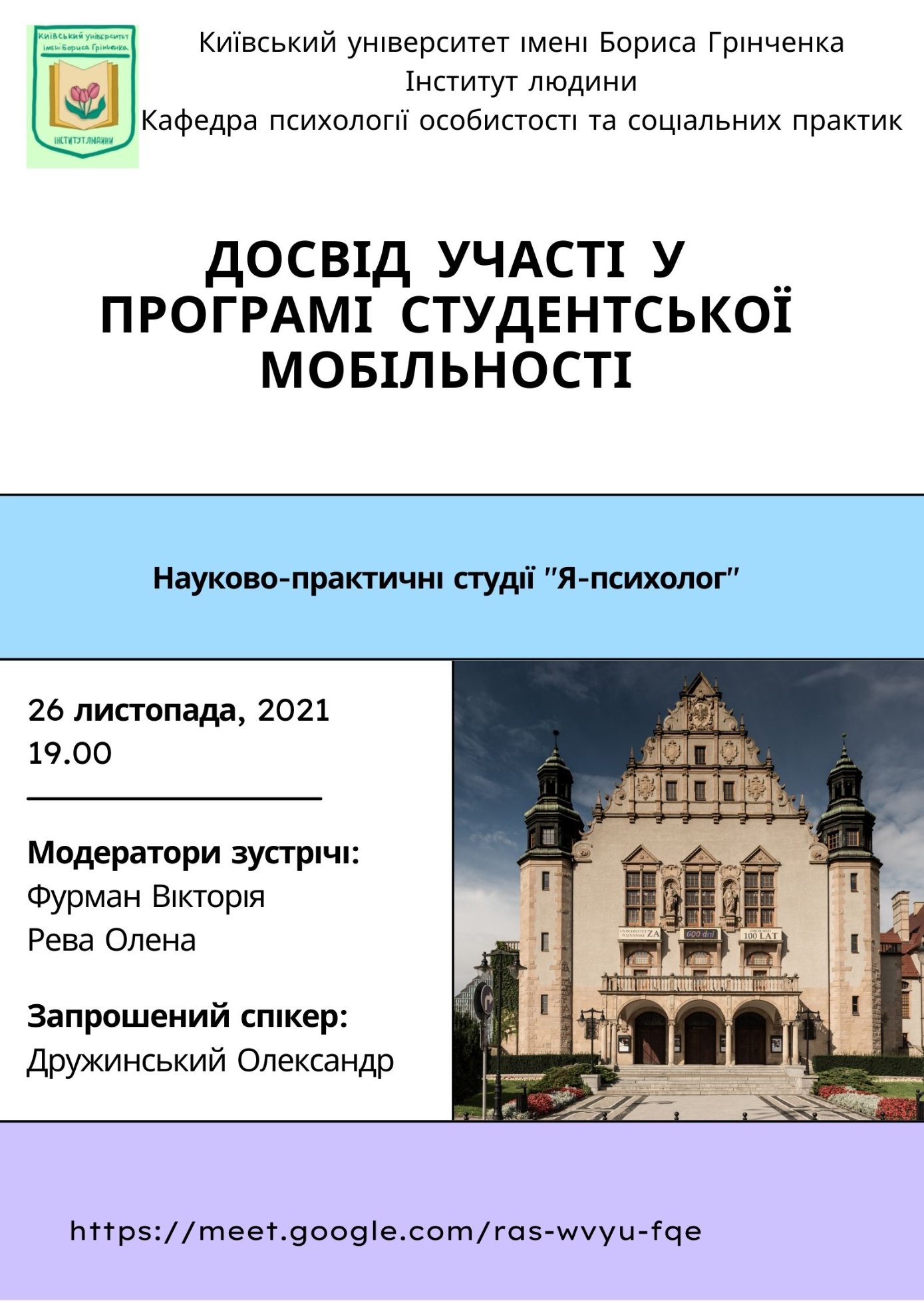 26 листопада 2021 відбулось чергове засідання науково-практичних студій "Я-психолог", за підтримки доцентів кафедри психології особистості та соціальних практик - Фурман В.В. та Реви О.М. із залученням студентів-психологів 1-го та 3-го курсів.