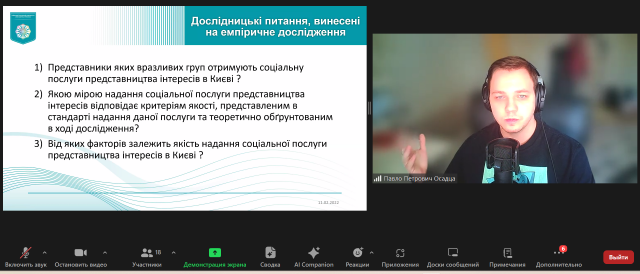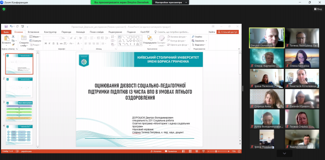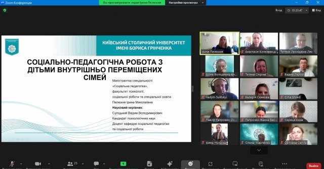 Презентація відбувалася в онлайн форматі. Участь у заході взяли студенти, їхні наукові керівники. На початку зустрічі з вітальним словом звернулася Тетяна ЛЯХ, завідувач кафедри соціальної педагогіки та соціальної роботи, гарант освітньої програми «Моніторинг і оцінка соціальних програм», кандидат педагогічних наук, професор, професор кафедри соціальної педагогіки та соціальної роботи Факультету психології, соціальної роботи та спеціальної освіти Київського столичного університету імені Бориса Грінченка, яка звернула увагу здобувачів на графік роботи над магістерською роботою та наголосила на необхідності його кореляції з індивідуальним планом роботи над магістерським дослідженням.
