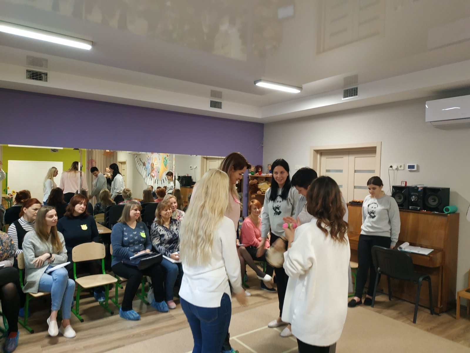 Під час заходу присутні ознайомилися із технологією "Складоритм", що розроблена в рамках реалізації наукової теми кафедри, а також мали можливість відпрацювати практичні навички методики Percussion play.