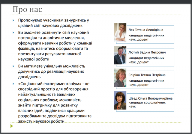 Під час зустрічі було презентовано програму наукового гуртка кафедри соціальної педагогіки та соціальної роботи "Соціальний експериментаніум", роботою якого керують доценти Вадим Лютий, Тетяна Лях, Тетяна Спіріна і Ольга Швед.